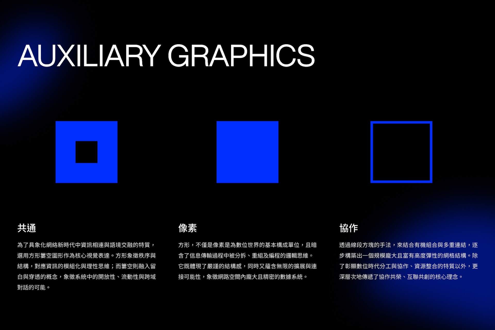 強調人與人之間的良性合作關係,線段與點的連合,點與點連結網路的型態。以像素小元素的點綴擺放,來表示人與現在ai的合作關係,並在色調上選用冷靜簡鍊的藍黑色為主色,加強科技秩序感。