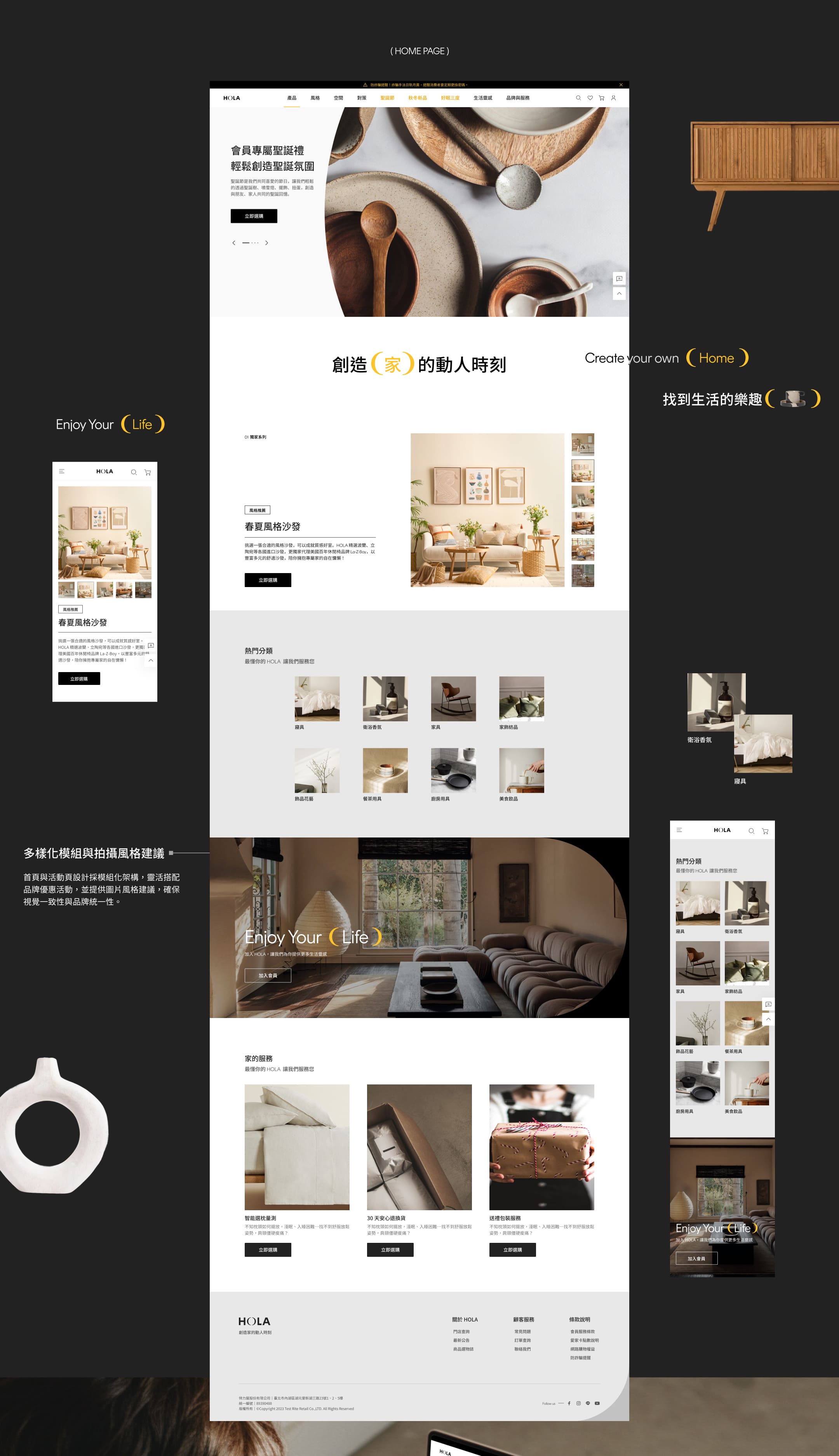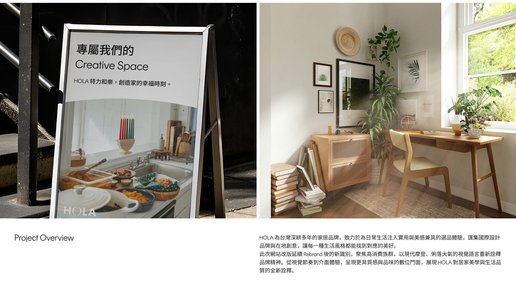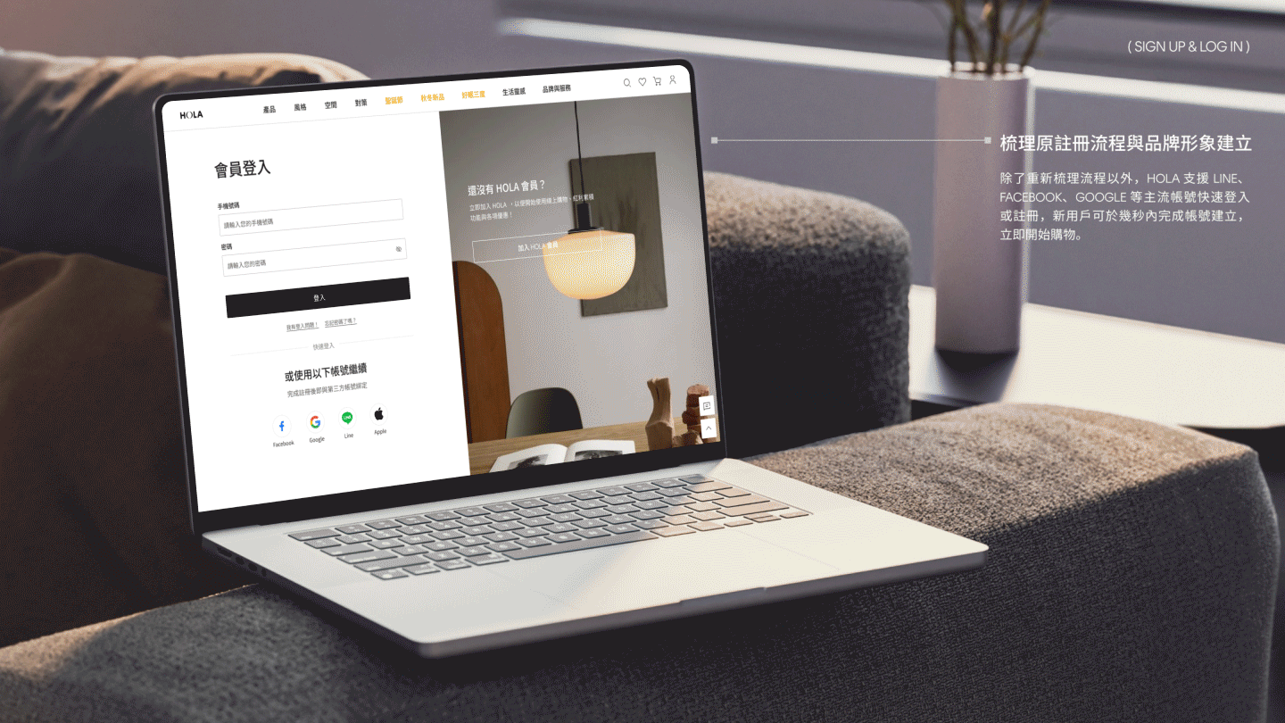 延續 HOLA Rebrand 後的新識別,聚焦高消費族群,以現代摩登、俐落大氣的視覺語言重新詮釋品牌精神。從視覺節奏到介面體驗,呈現更具質感與品味的數位門面,展現 HOLA 對居家美學與生活品質的全新詮釋。
