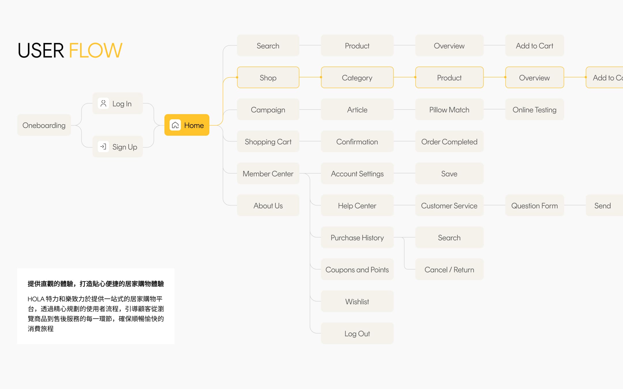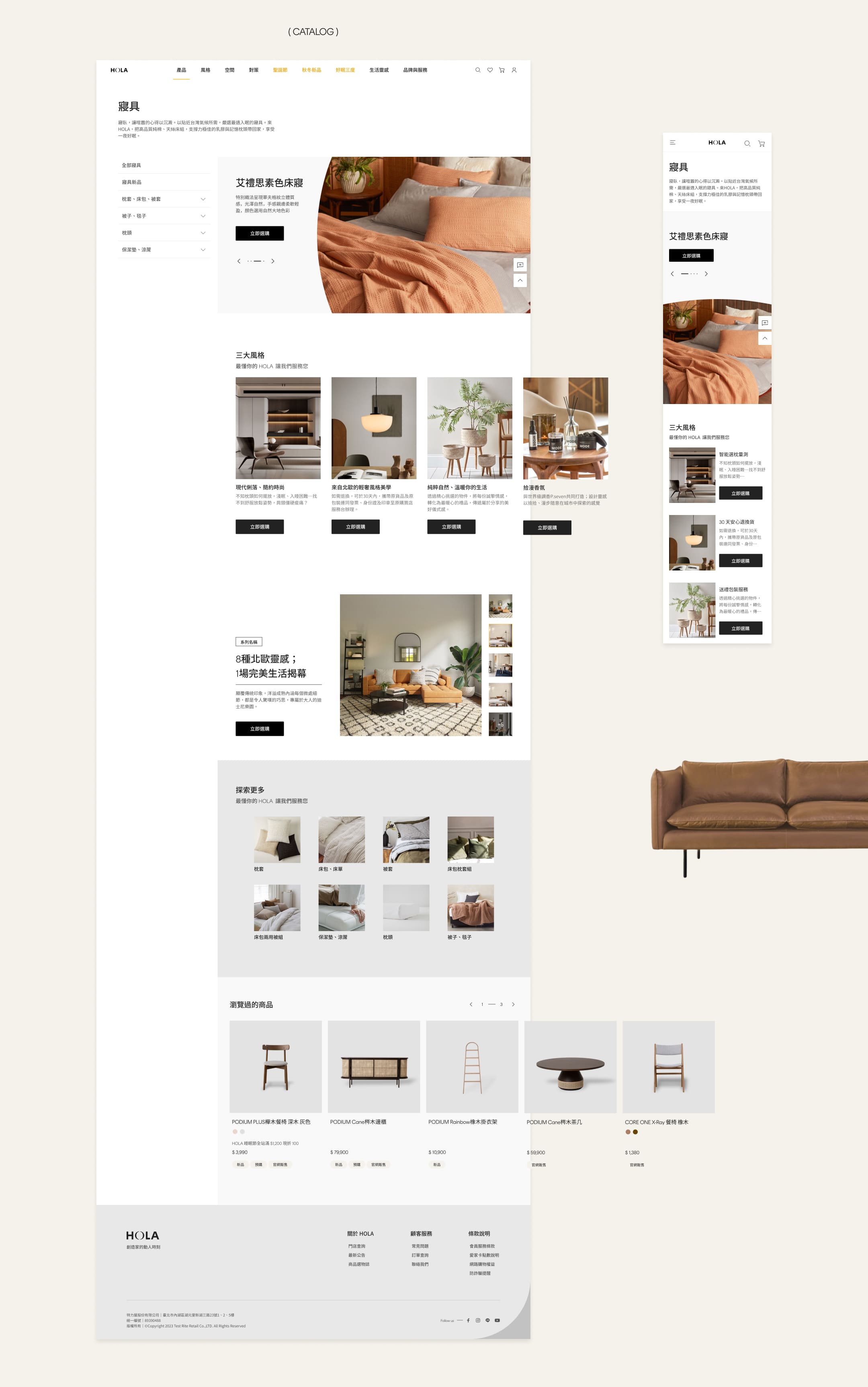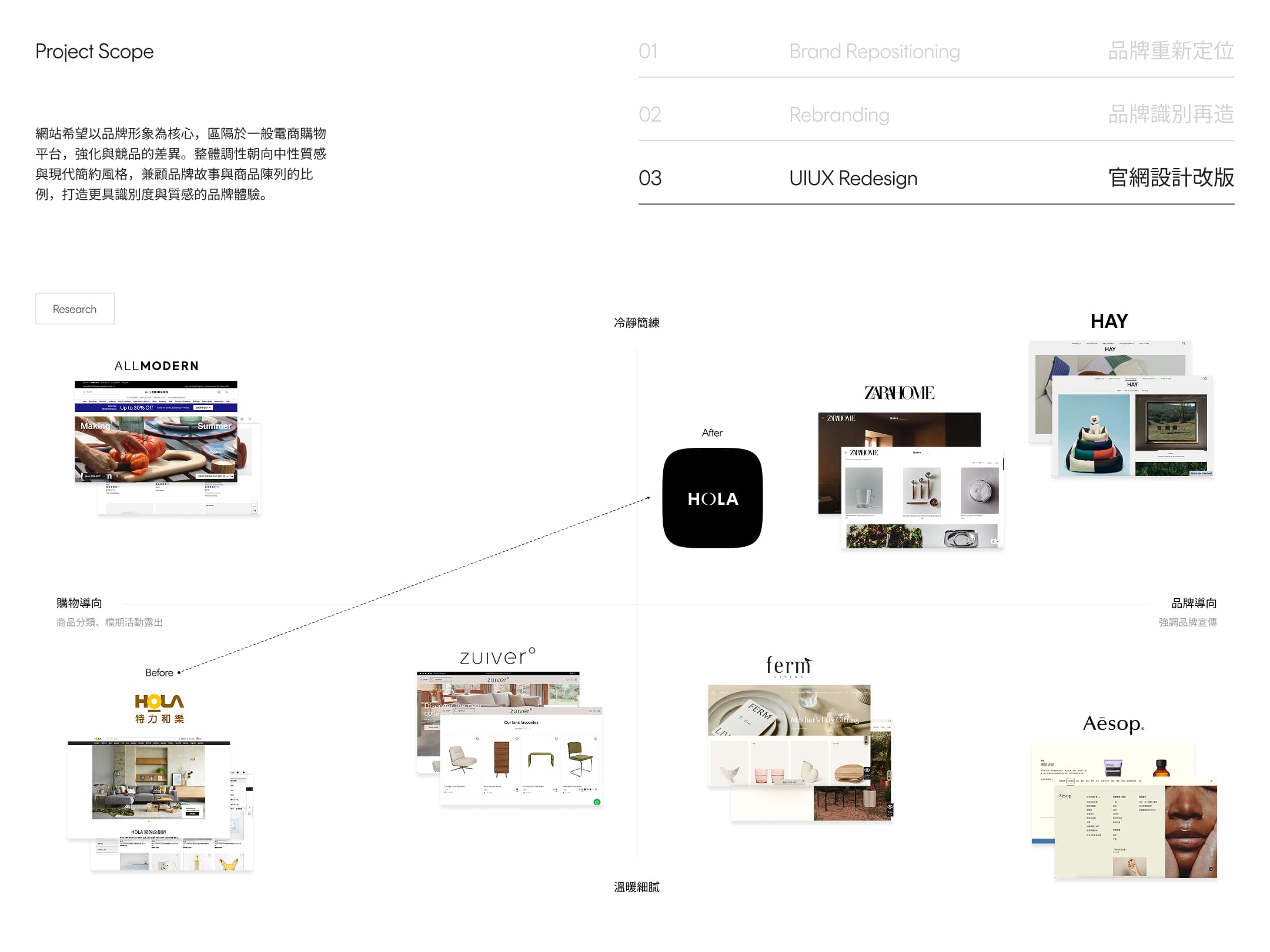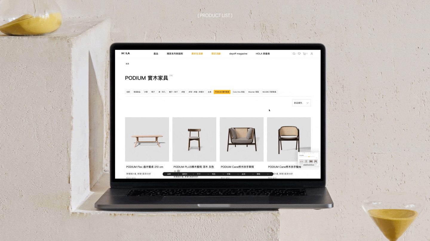 HOLA 希望以品牌形象為核心,區隔於一般電商購物平台,強化與競品的差異。整體調性朝向中性質感與現代簡約風格,兼顧品牌故事與商品陳列的比例,打造更具識別度與質感的品牌體驗。