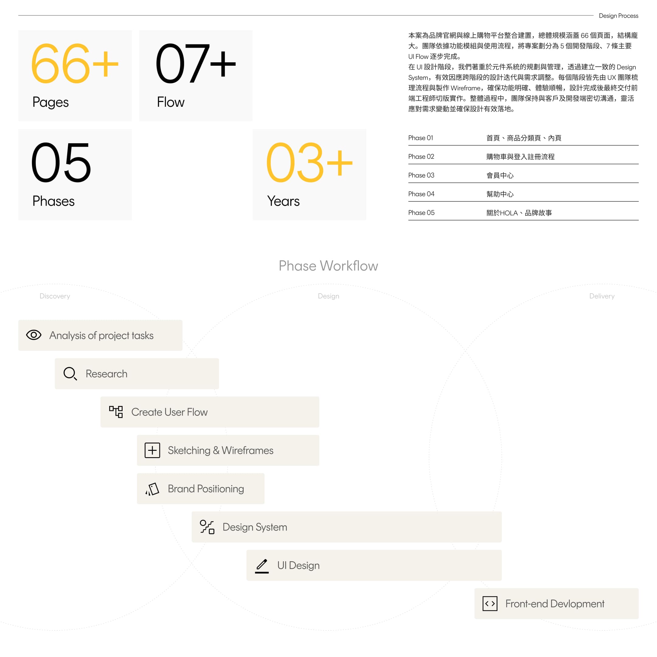 本案為品牌官網與線上購物平台整合建置,總體規模涵蓋 66 個頁面,結構龐大。團隊依據功能模組與使用流程,將專案劃分為 5 個開發階段、7 條主要 UI Flow 逐步完成。