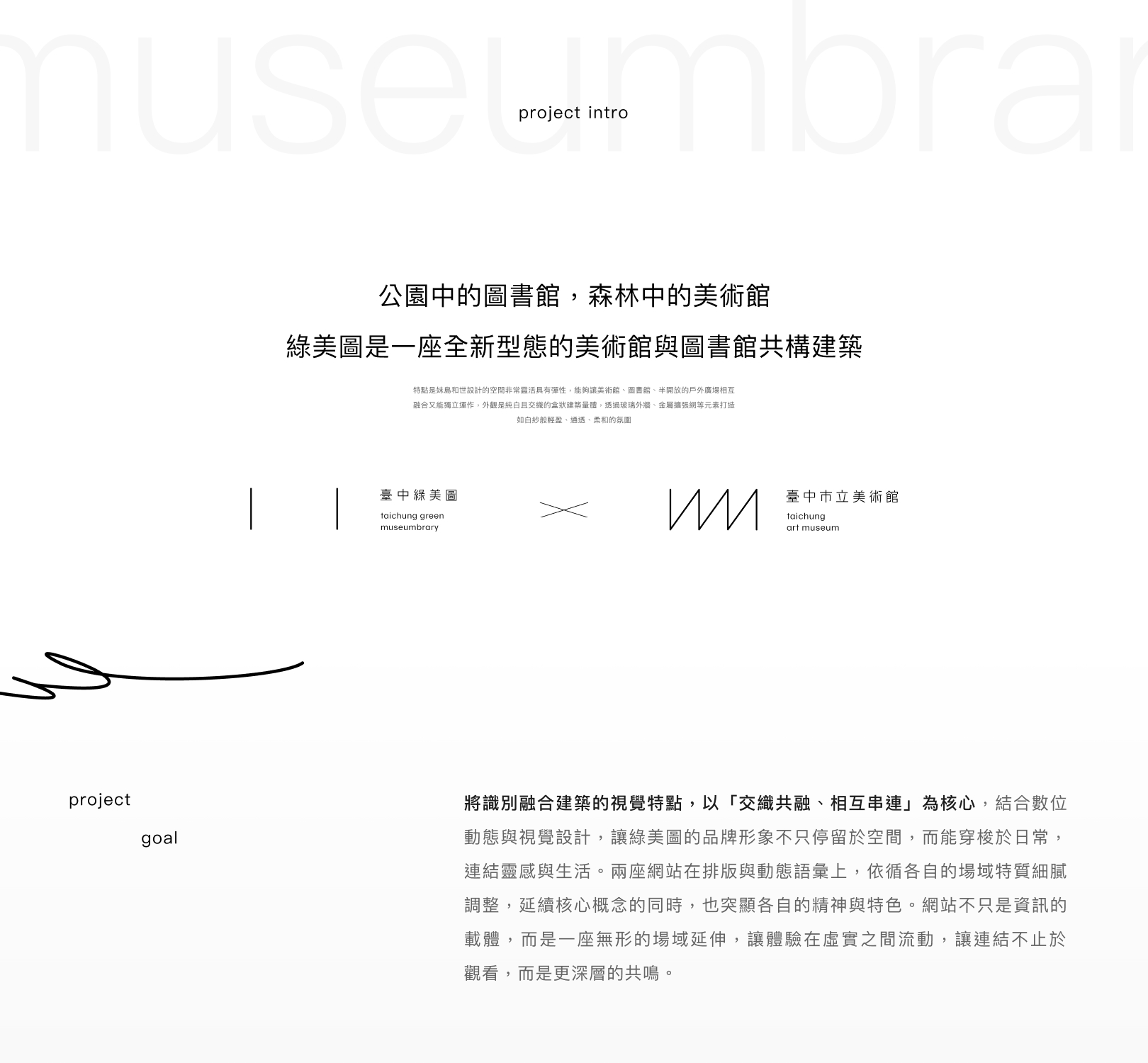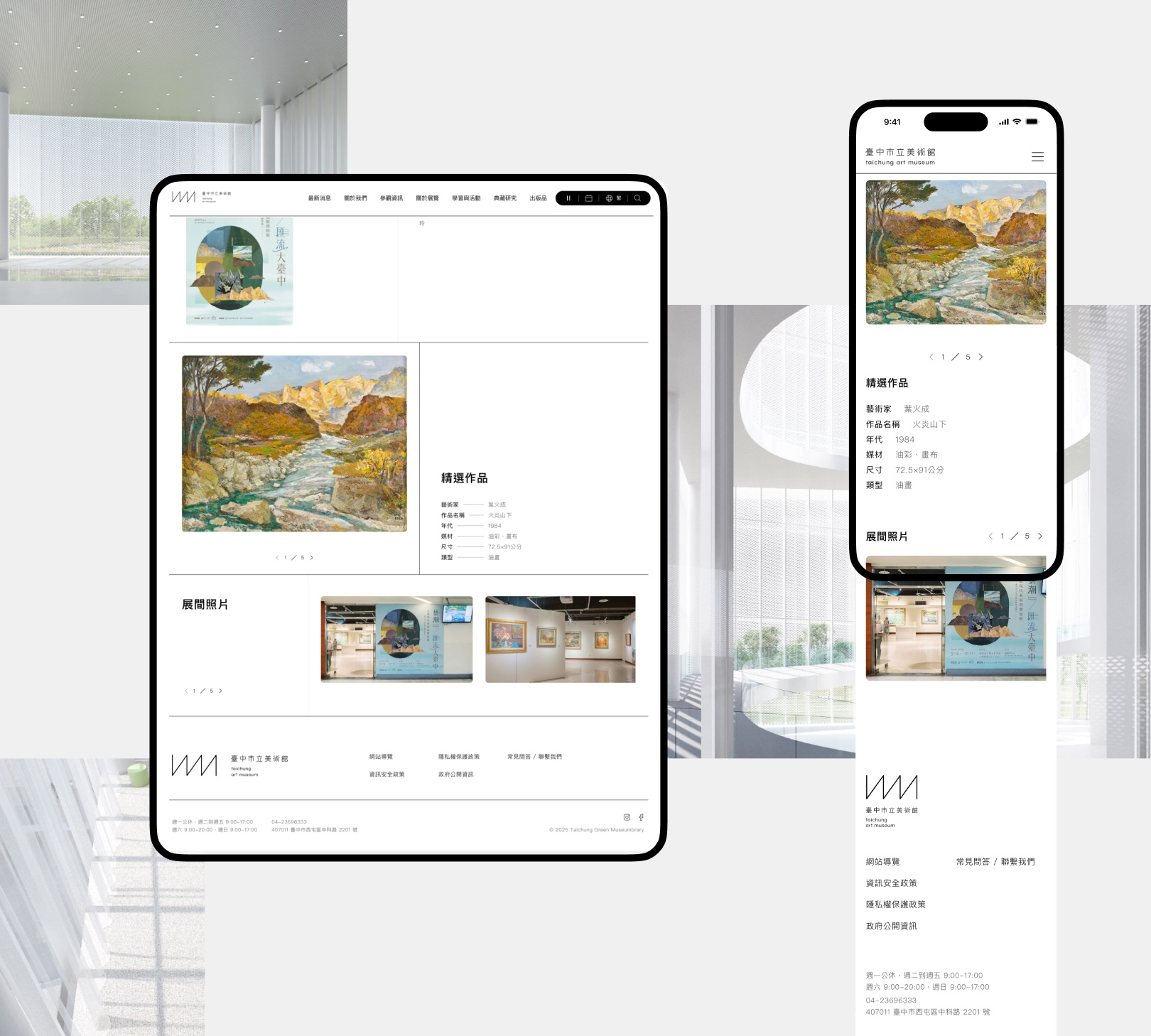 作為融合圖書館與美術館功能的文化場域,綠美圖致力於推廣藝術、設計與綠色永續理念。它不僅是閱讀與知識交流的空間,更是一個連結社群、啟發創意的場域,透過展覽、講座與多元文化活動,為大眾提供豐富的藝術與設計體驗。專案涵蓋綠美圖與臺中市立美術館官方網站,以綠美圖品牌識別為核心,打造融合建築理念、連結視覺情感的數位體驗。